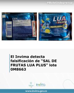 El INVIMA identificó que el lote 0M8663 de Sal de Frutas Lua Plus ha sido falsificado.
